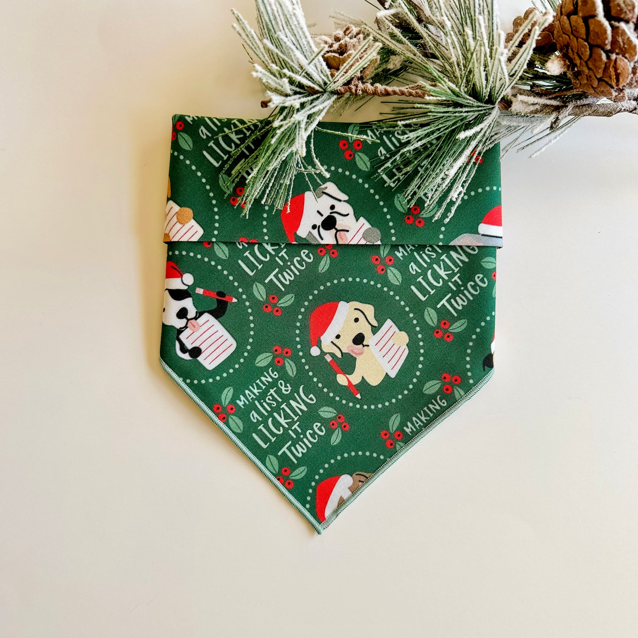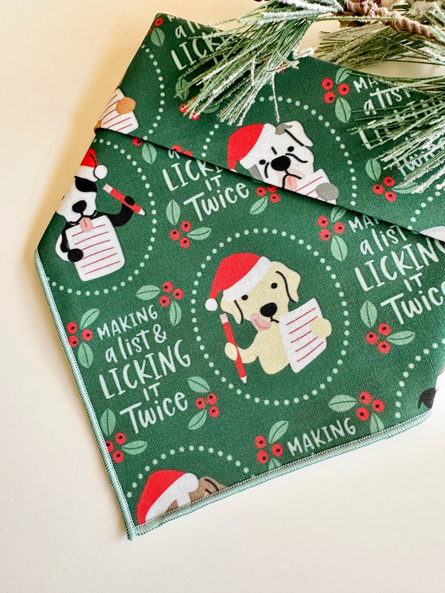 LICKING THE LIST - Bandana background is dark green, has cute dogs writing lists, and says "making a list & licking it twice." This bandana is finished with a secure overlock seam in mint green. This bandana is made from a cotton material.