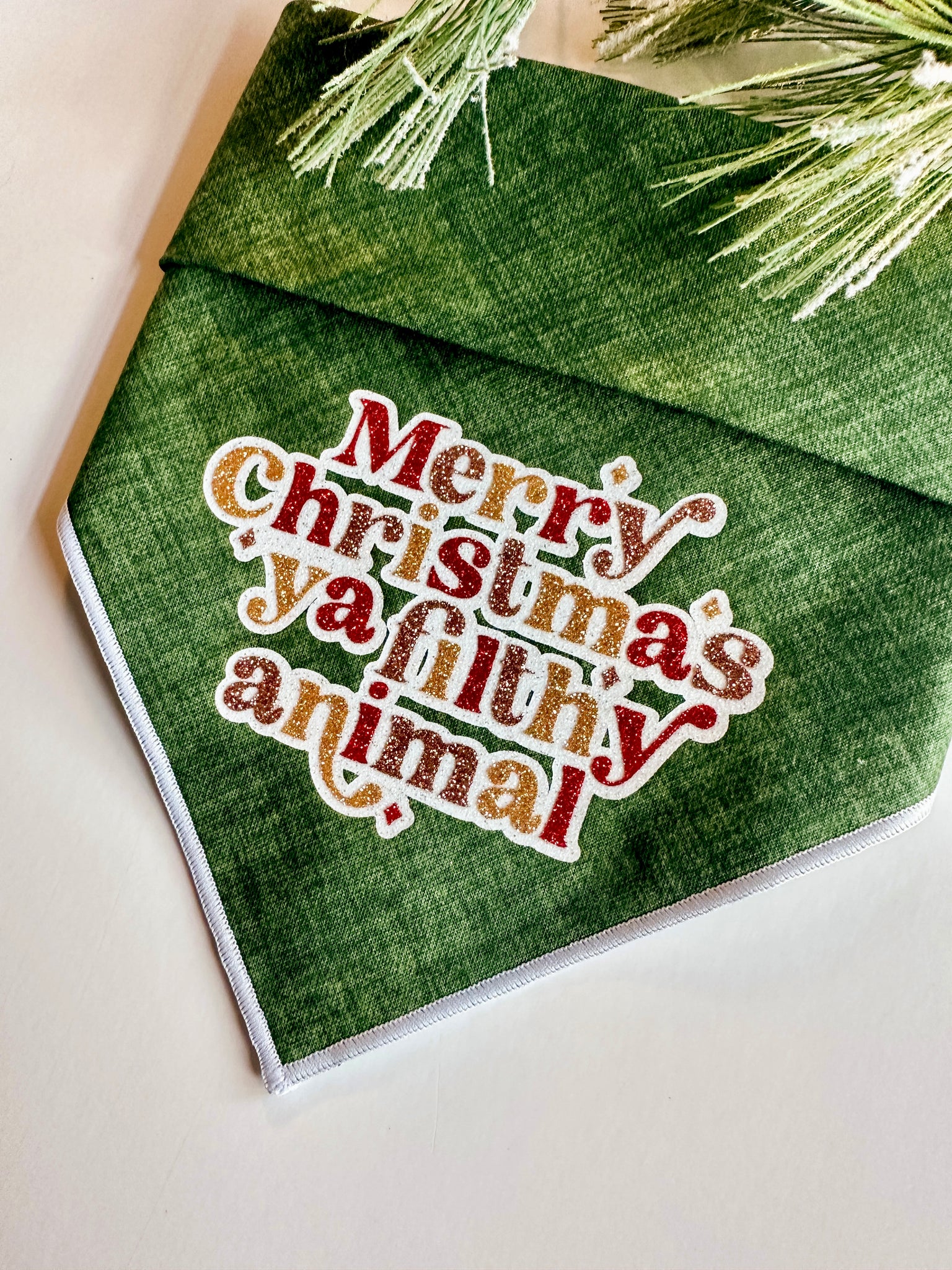 MERRY CHRISTMAS YA FILTHY ANIMAL - Bandana background is a linen-looking green fabric and says "Merry Christmas ya filthy animal" in sparkly white, brown, gold & red glitter. This bandana is finished with a secure overlock seam in white. This bandana is made from a cotton material.