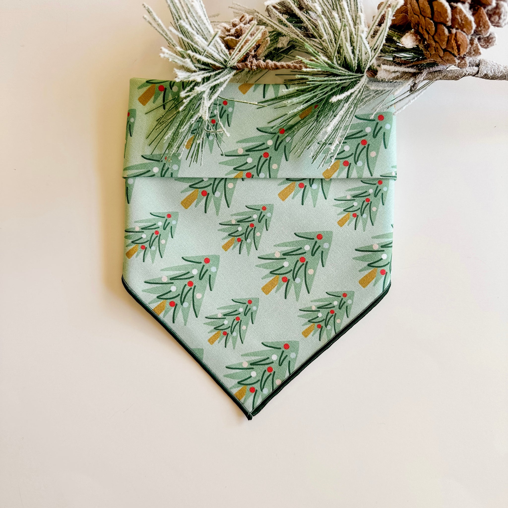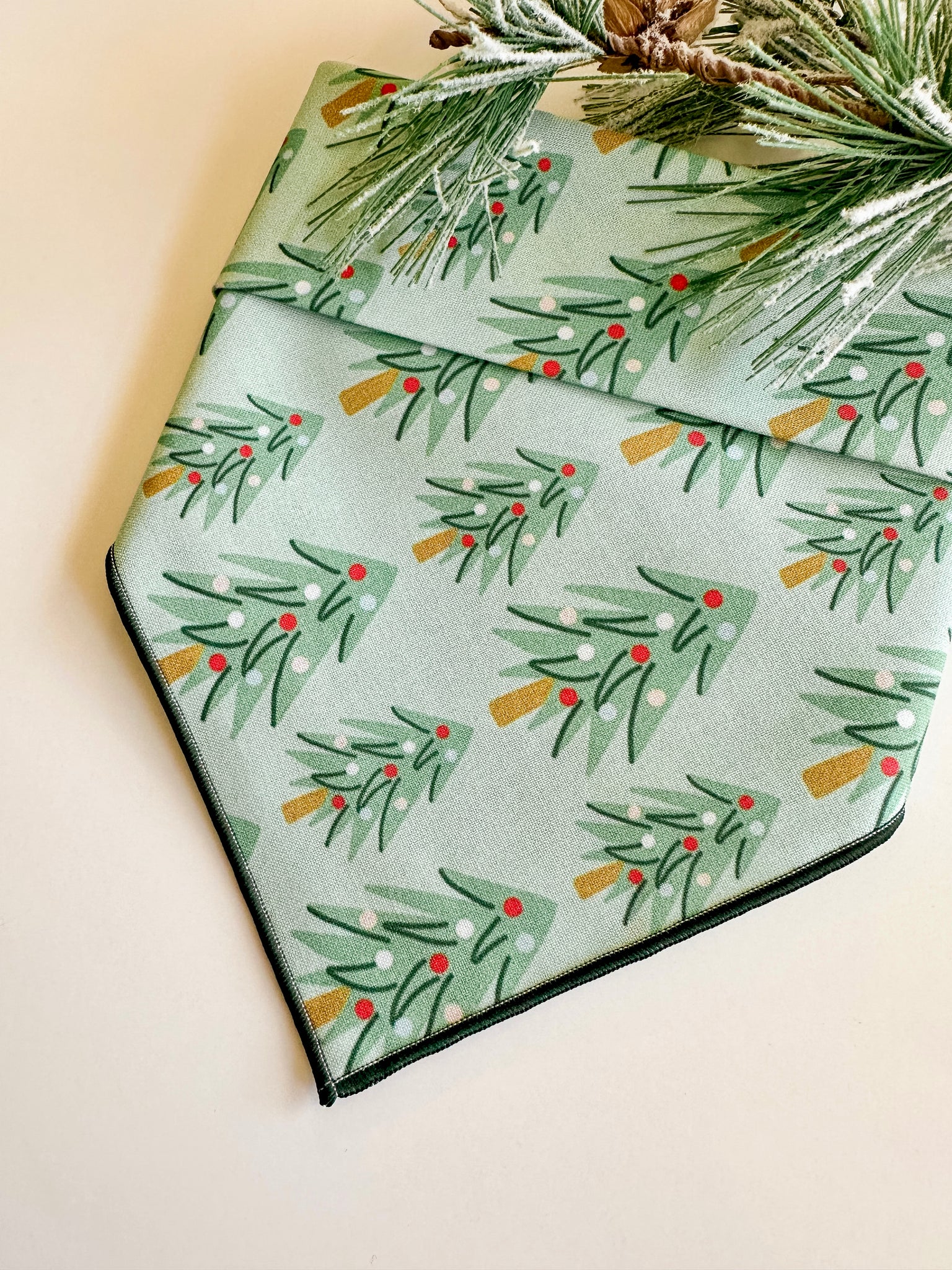 OH CHRISTMAS TREE - Bandana background is light green with cute Christmas trees all over it. This bandana is finished with a secure overlock seam in dark green. This bandana is made from a cotton material.