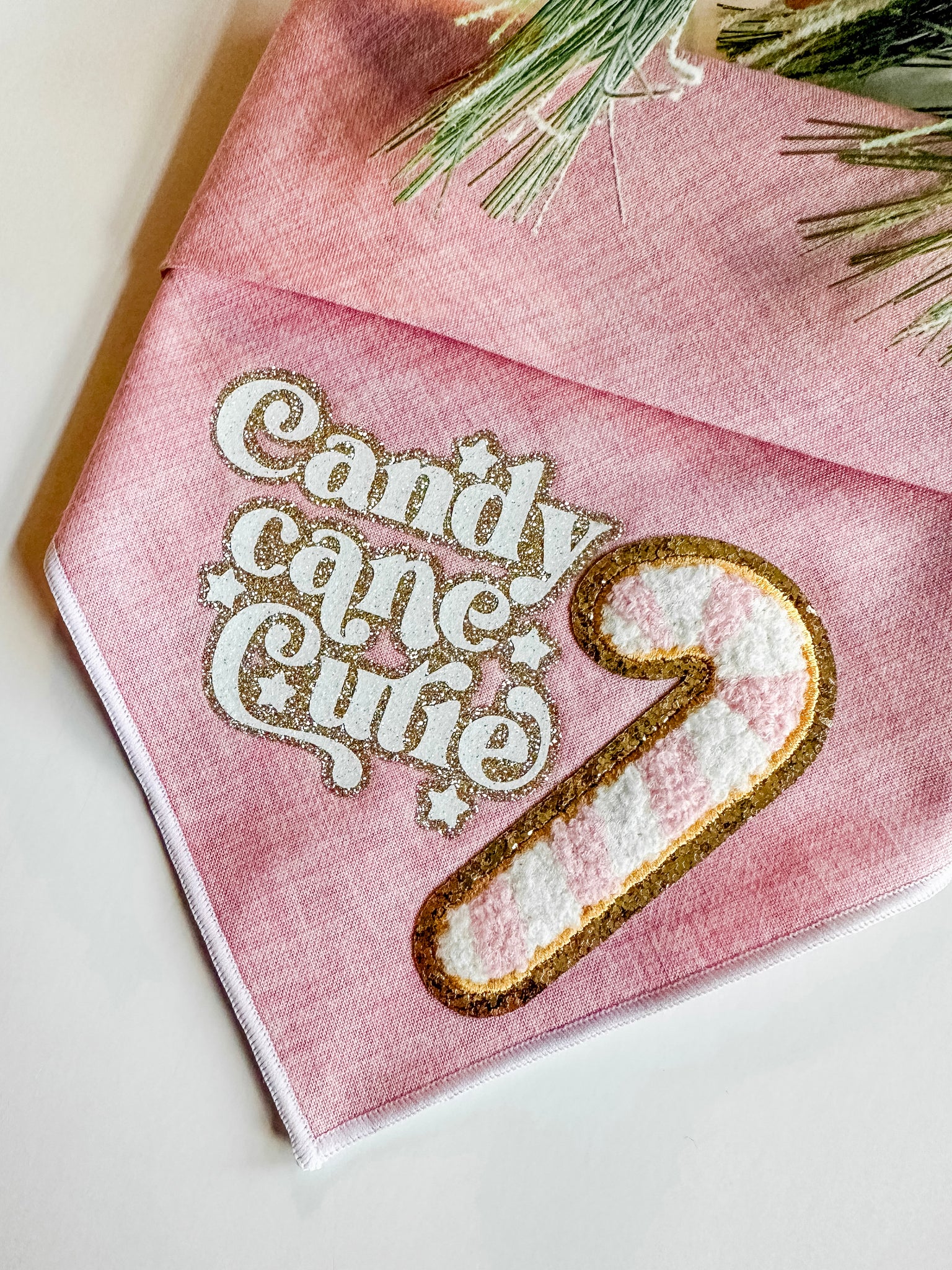 PINK CANDY CANE CUTIE - Bandana background is a linen-looking pink fabric and says "candy cane cutie" in sparkly white & champagne glitter. It also has a pink & white candy cane patch on it. This bandana is finished with a secure overlock seam in white. This bandana is made from a cotton material.