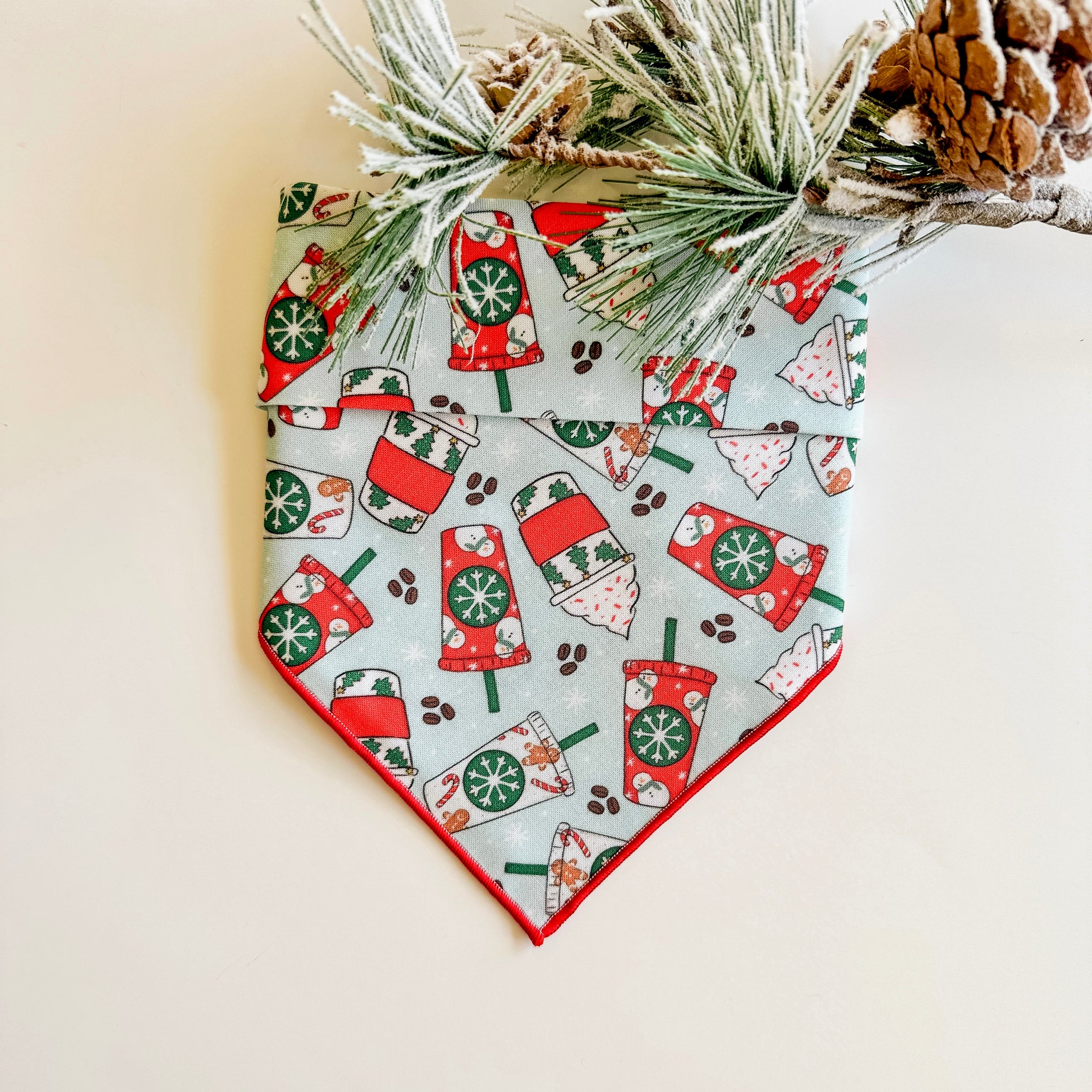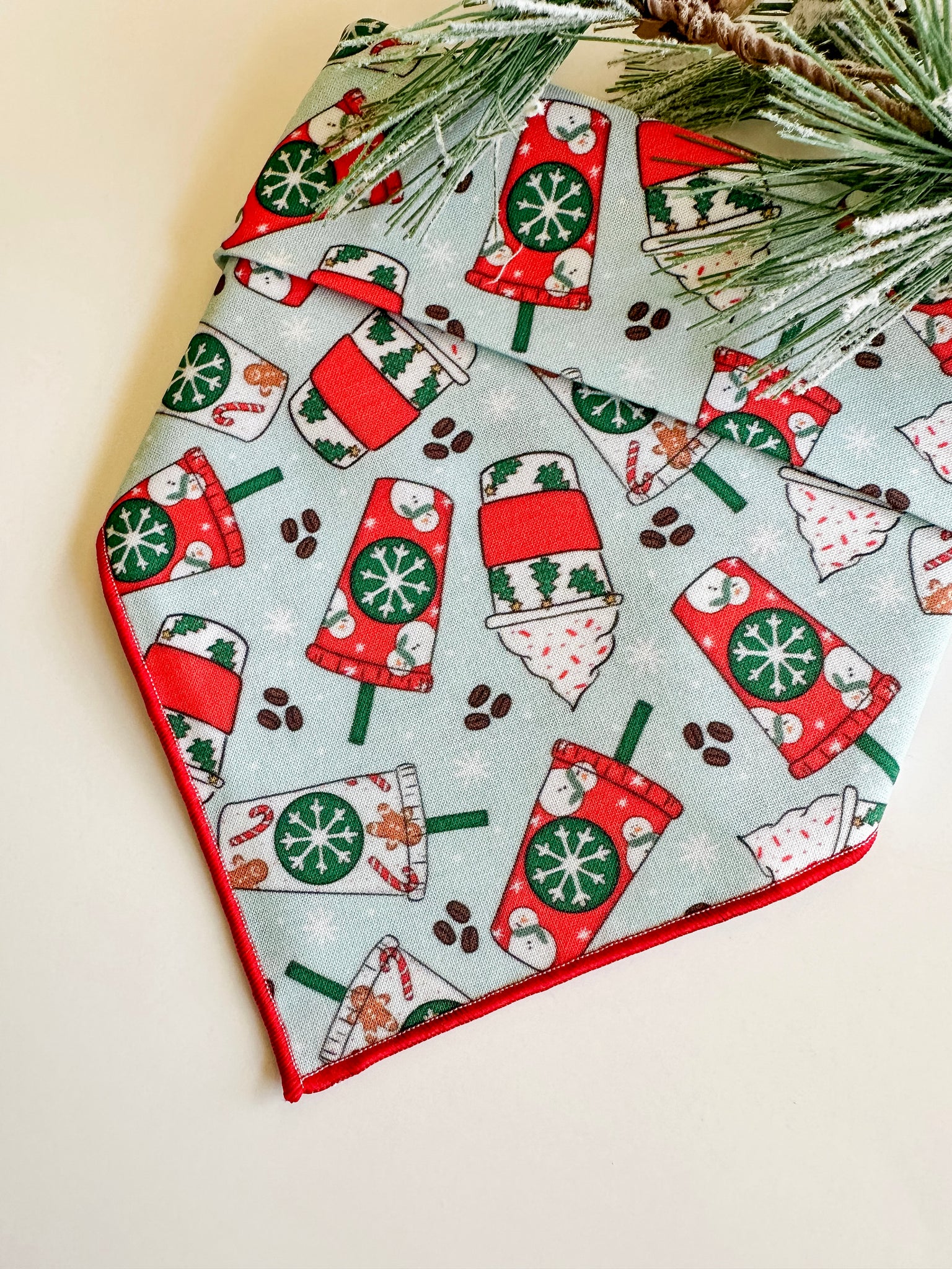 RED CUP SEASON - Bandana background is aqua blue and has red and green coffee cups all over it.This bandana is finished with a secure overlock seam in red. This bandana is made from a cotton material.