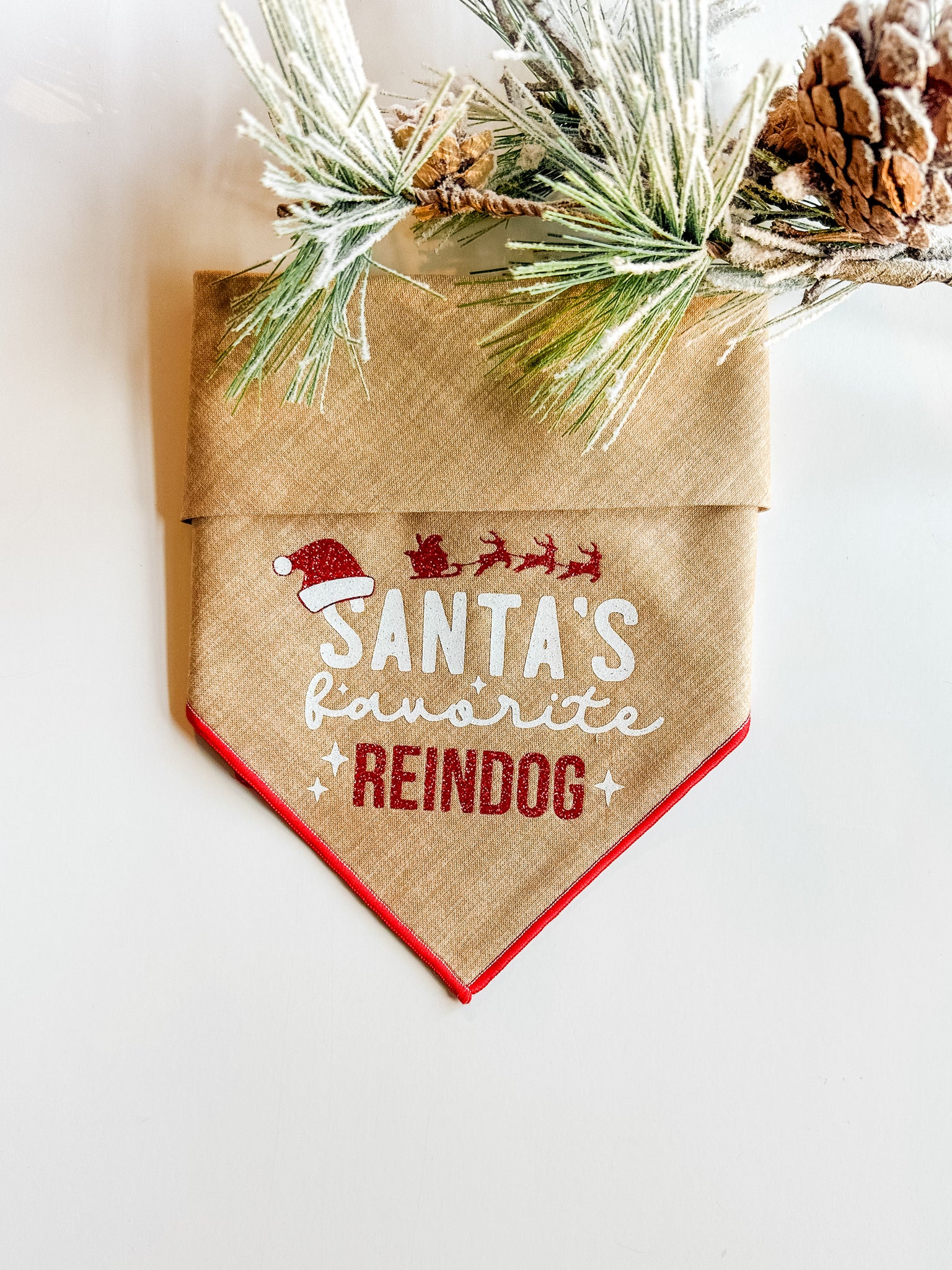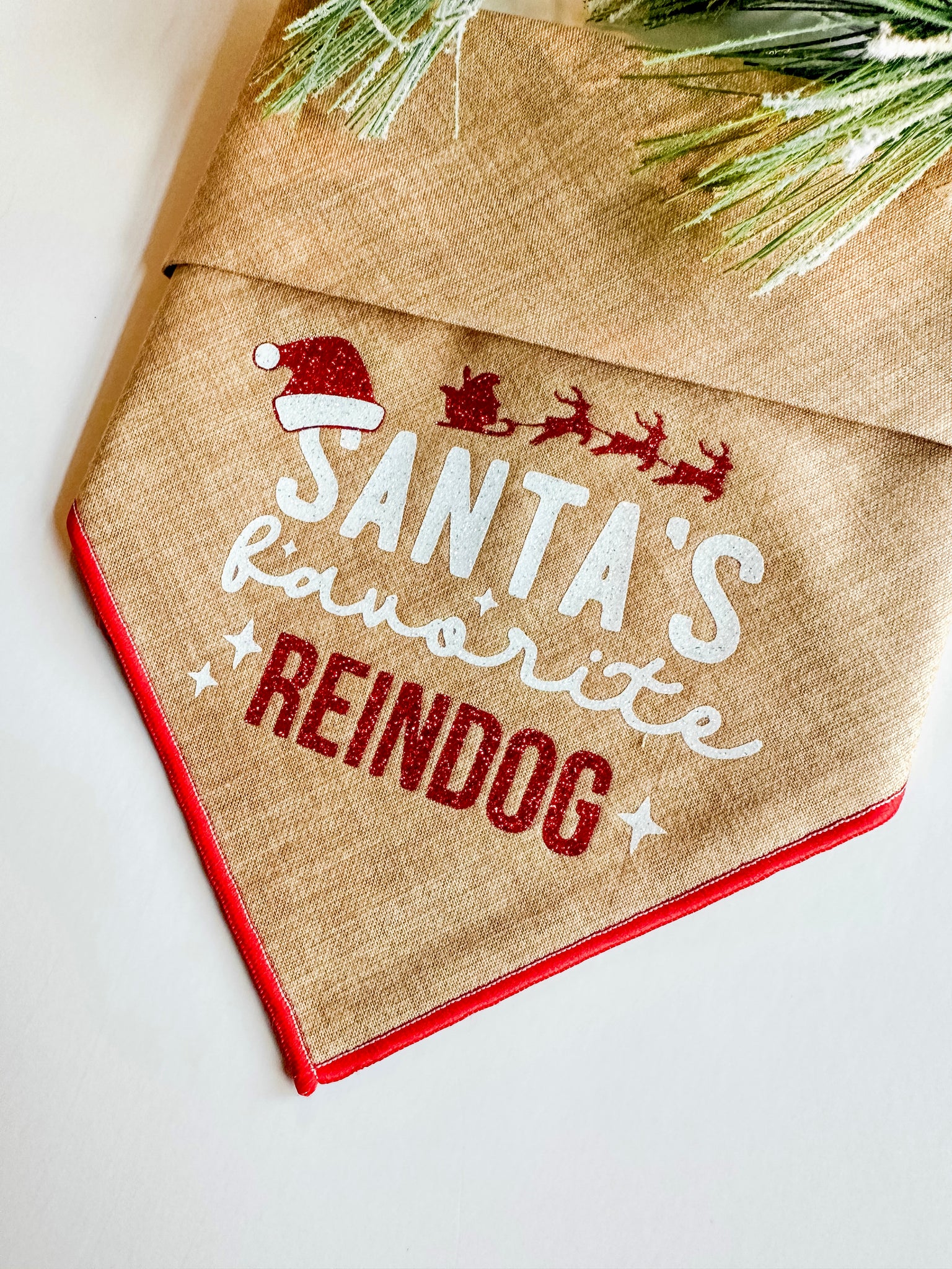 SANTA'S FAVORITE REINDOG - Bandana background is a linen-looking tan fabric and says "Santa's favorite reindog" in sparkly white & red glitter. It also has Santa's sleigh, reindeer, and hat on it. This bandana is finished with a secure overlock seam in red. This bandana is made from a cotton material.