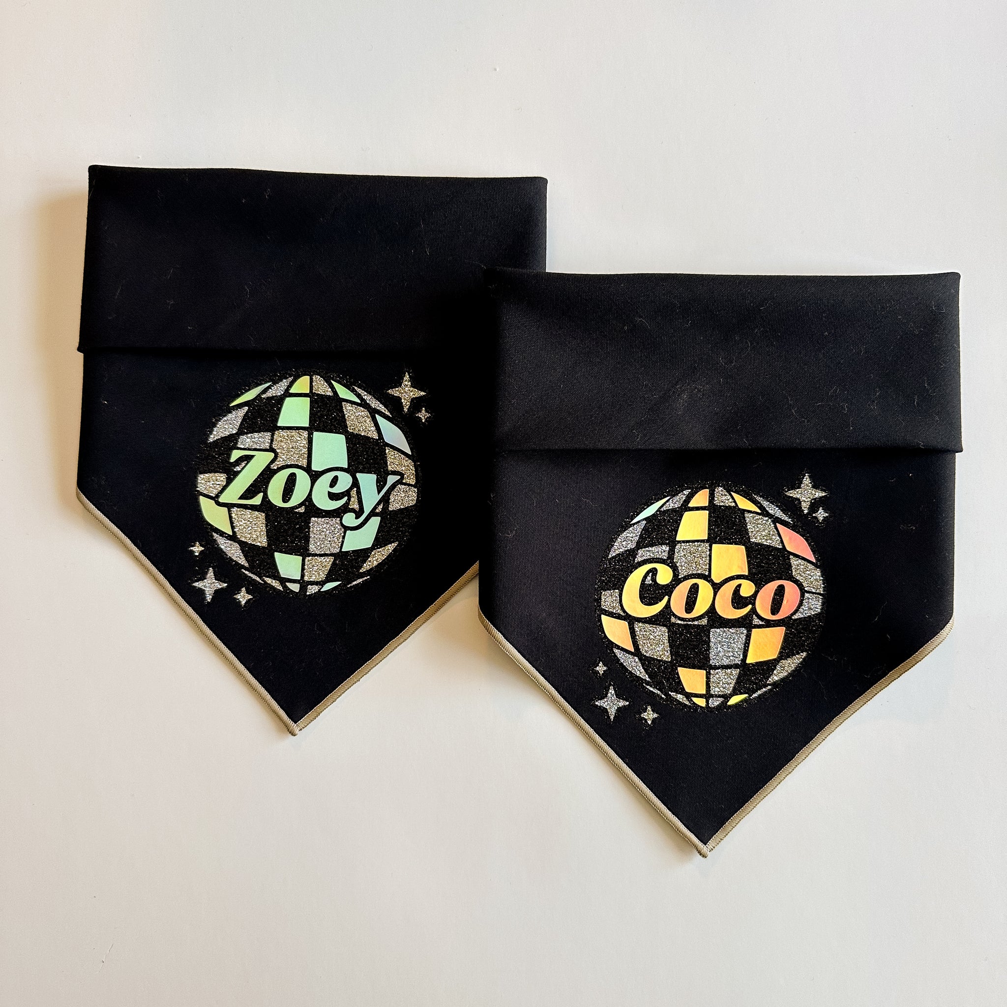 DISCO BALL - Get ready to PAWTY! Bandana background is solid black & is printed using really fun HTV: champagne glitter, silver glitter, black glitter & holographic vinyl. This bandana is finished with a secure rolled hem in champagne.