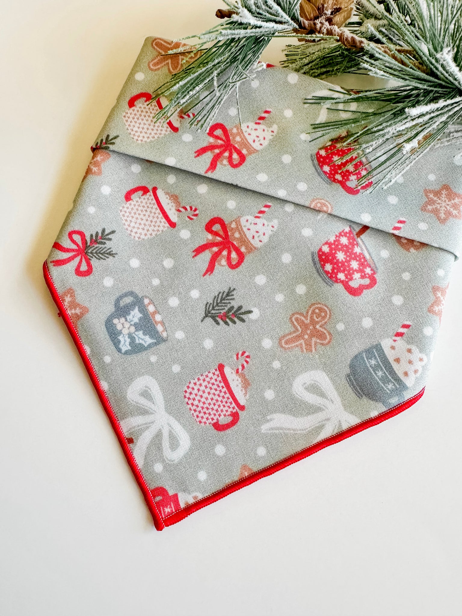 CHRISTMAS COCOA - Bandana background is sage green with cute Christmas Hot Cocoa mugs and bows all over it. This bandana is finished with a secure overlock seam in red. This bandana is made from a cotton material.