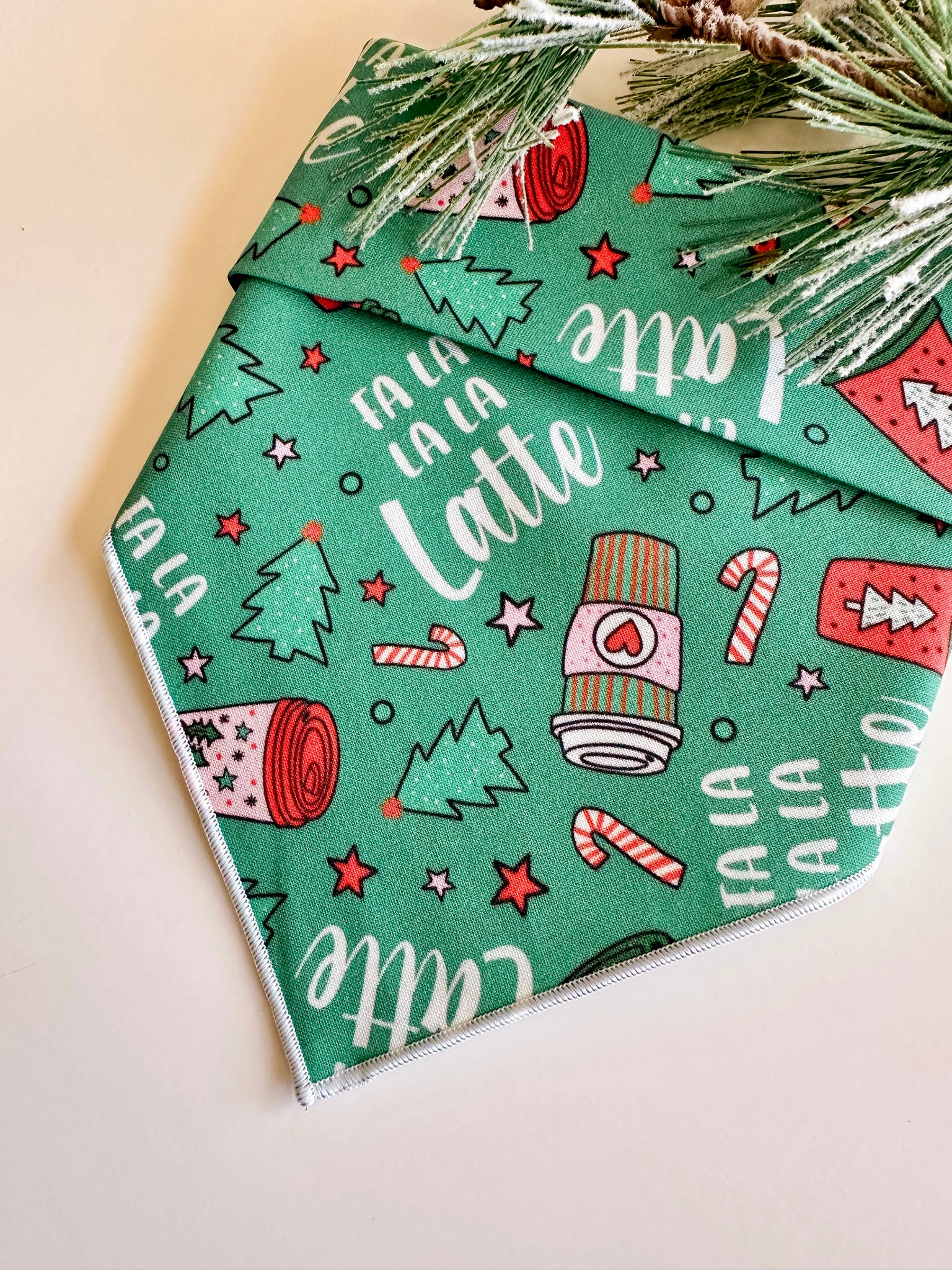 FA LA LA LA LATTE - Bandana background is green with Christmas lattes all over it and says "fa la la la latte." This bandana is finished with a secure overlock seam in white. This bandana is made from a cotton material.