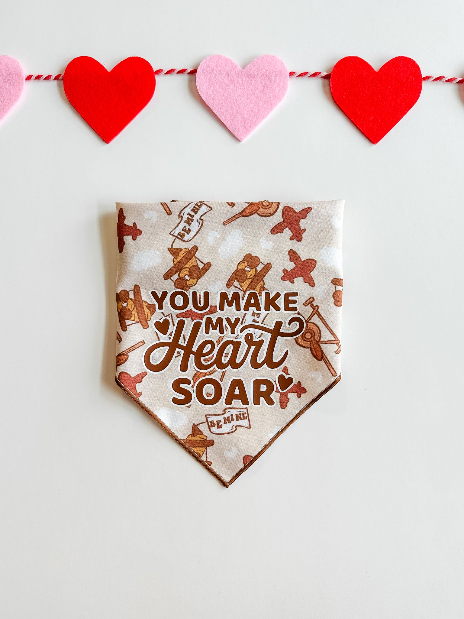 LOVE IS IN THE AIR- Bandana background is light brown with cute little airplanes with banners that say "be mine" all over it. This bandana is finished with a secure rolled hem in brown. This bandana is made of a cotton material