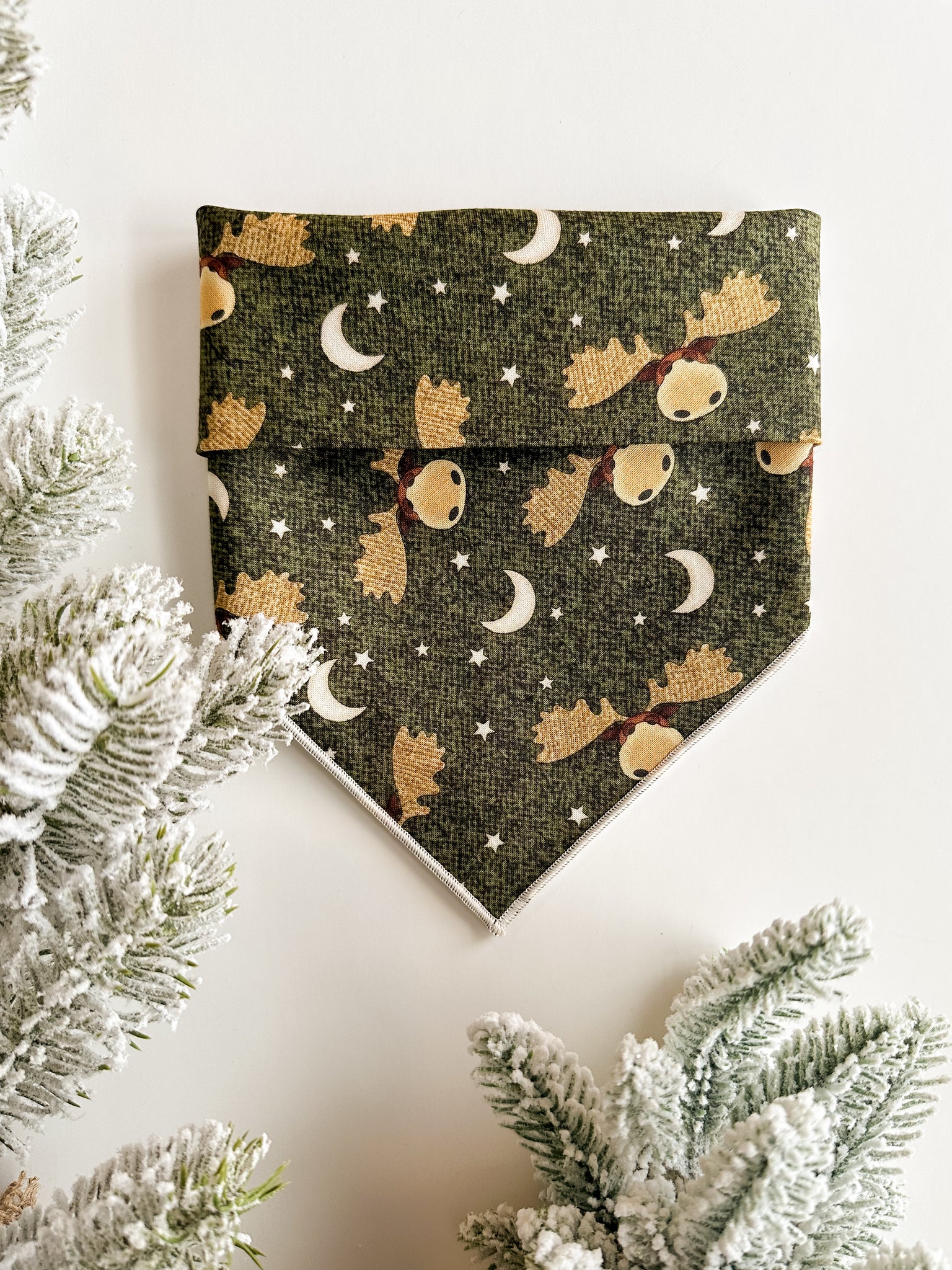 WINTER MOOSE - Bandana background is a forest green with cute moons, stars & moose icons all over it. This bandana is finished with a secure rolled hem in cream. This bandana is made from a cotton material.
