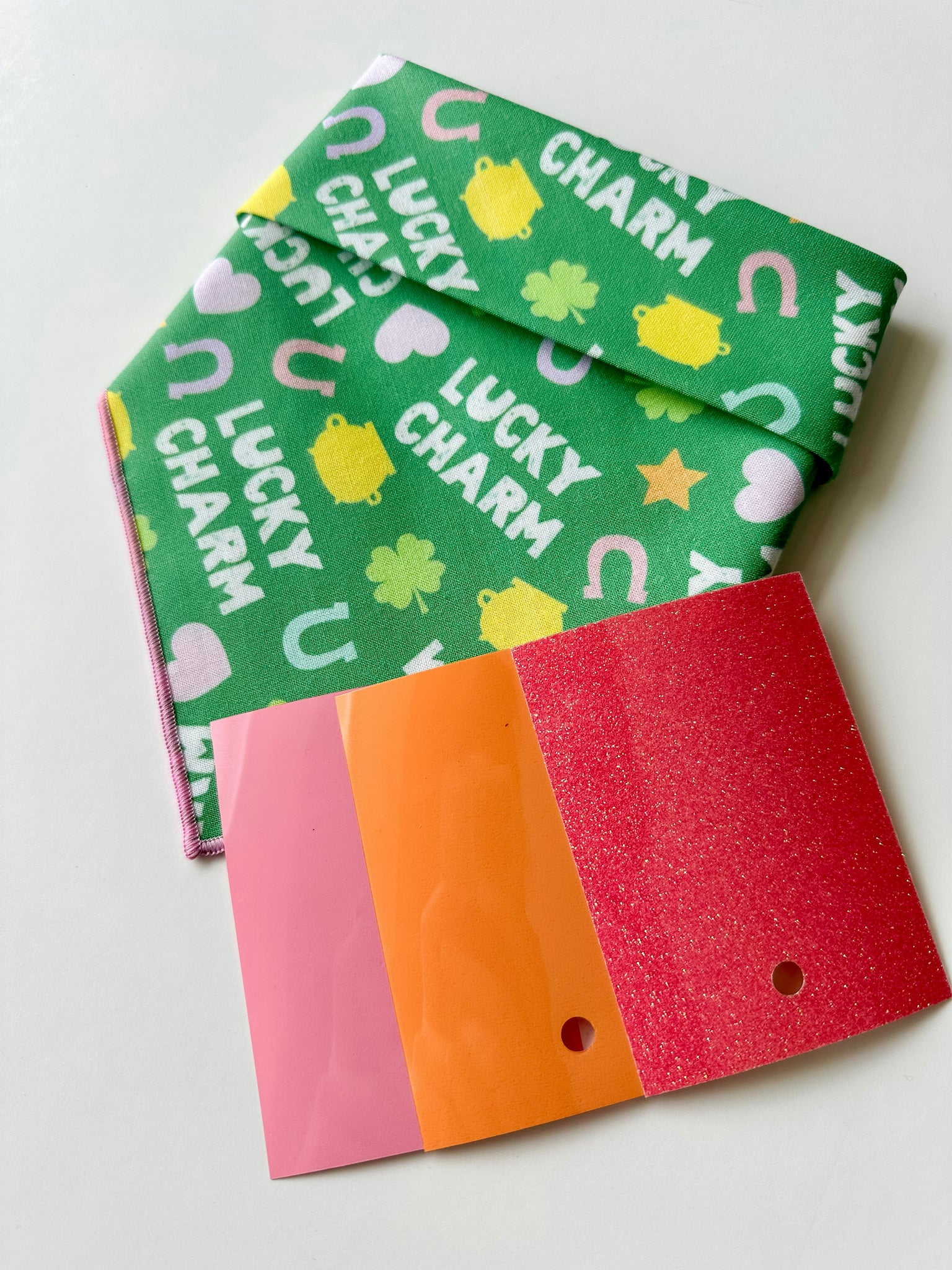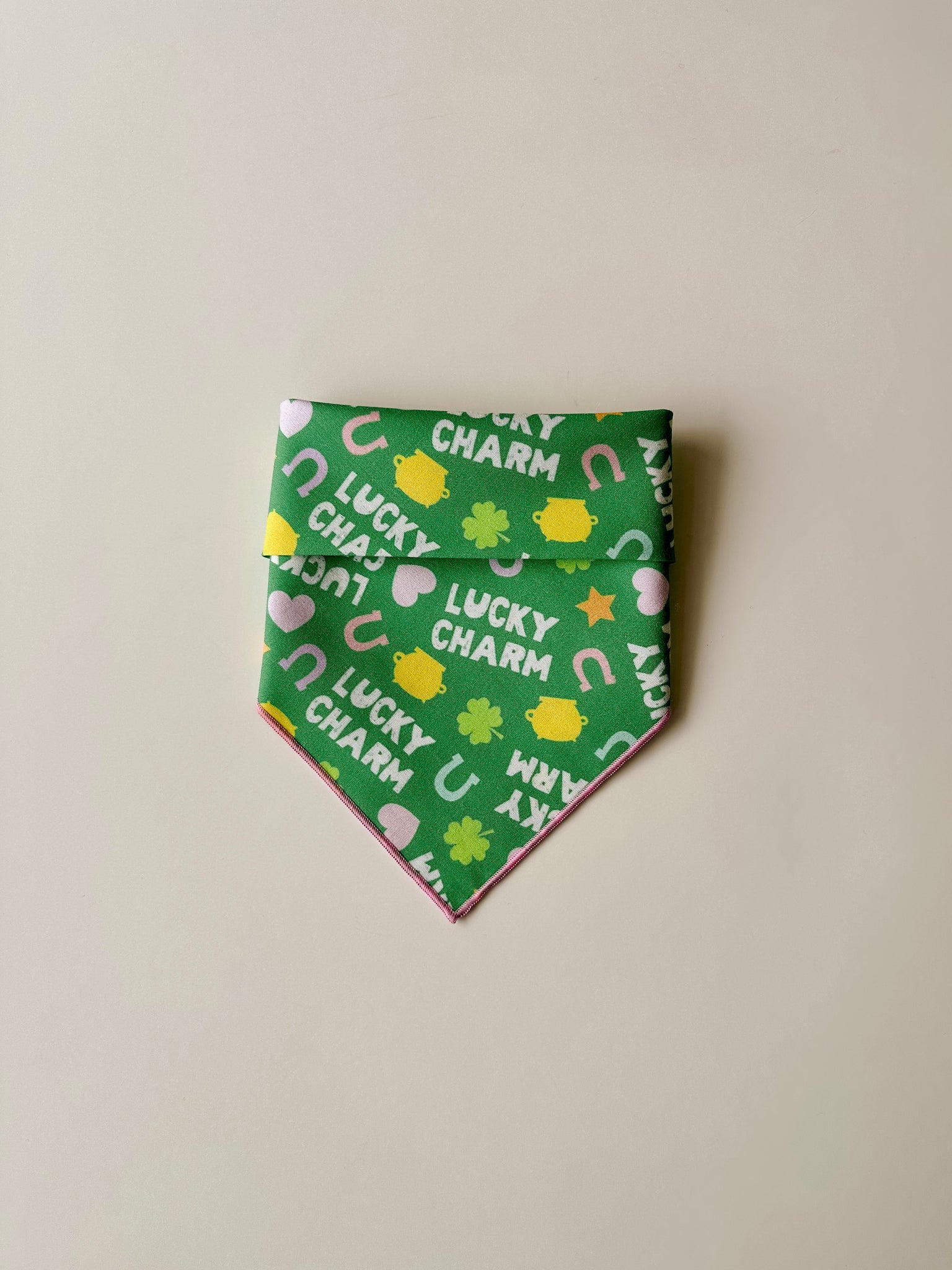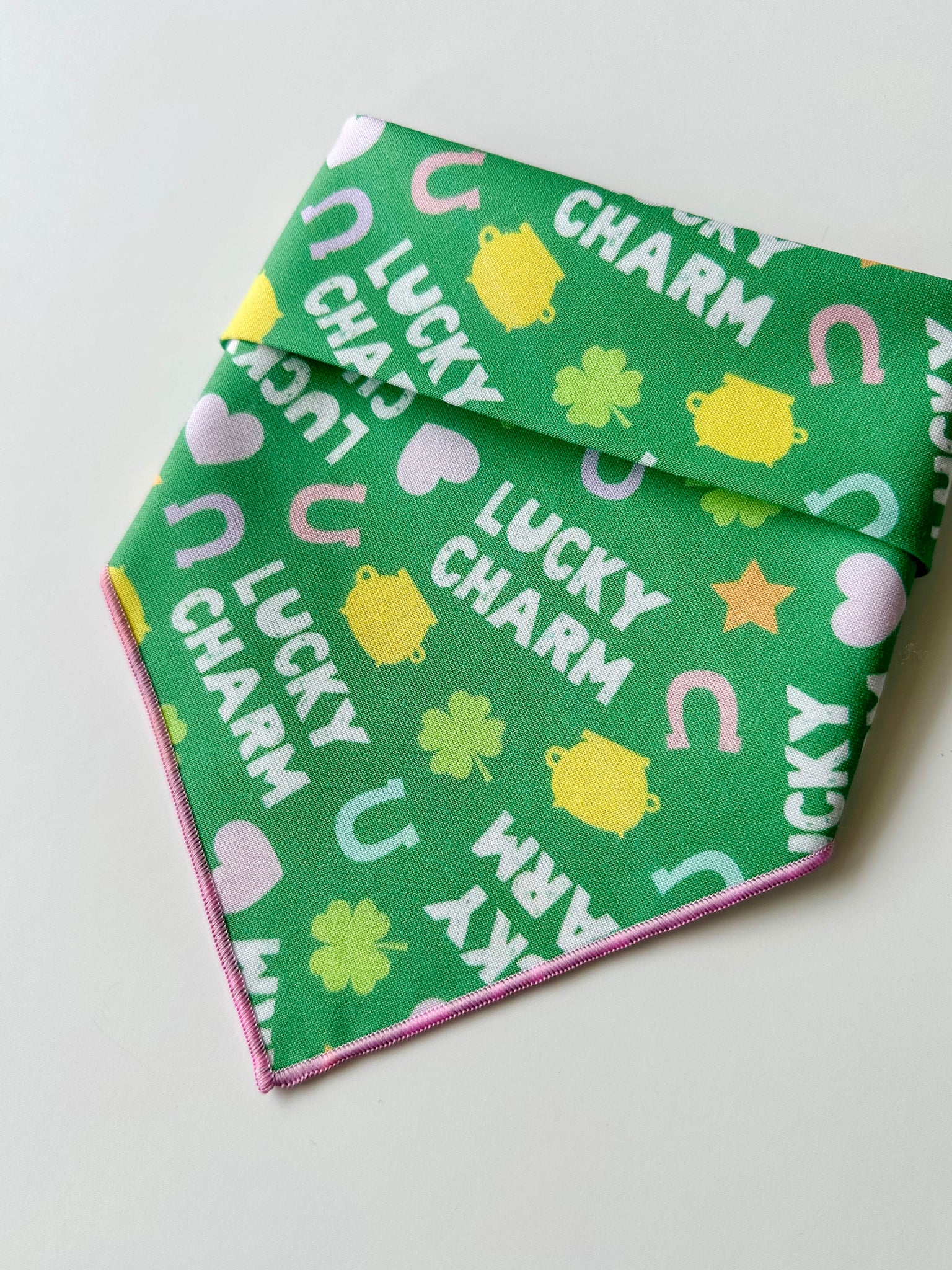 LUCKY CHARM - Bandana background is green with lucky charm icons, and says, "lucky charm" all over it. This bandana is finished with a secure rolled hem in light pink. This bandana is made of a cotton material.