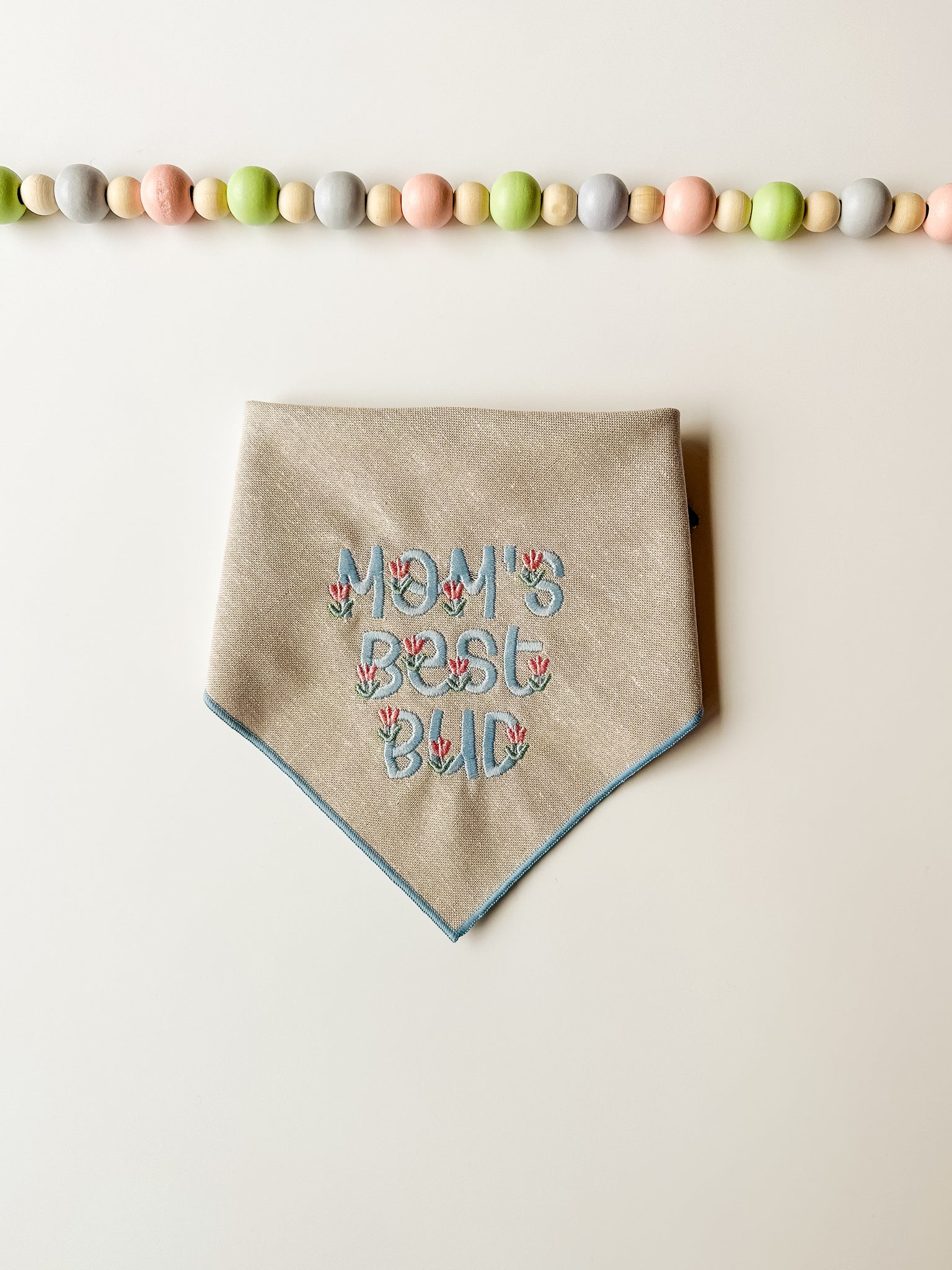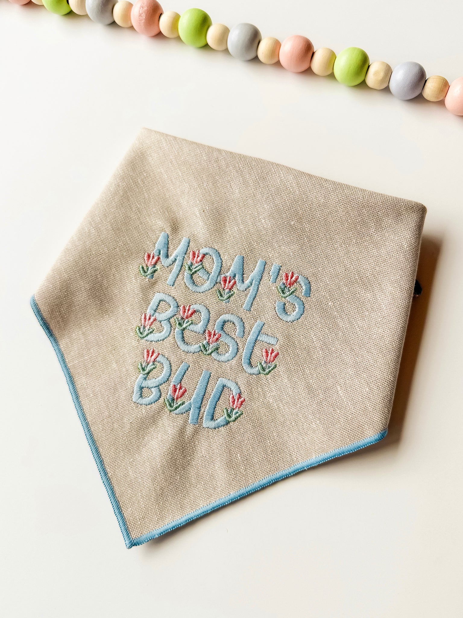 MOM’S BEST BUD - Bandana background is is a neutral linen material. This bandana is finished with a rolled hem in light blue that matches the embroidery.