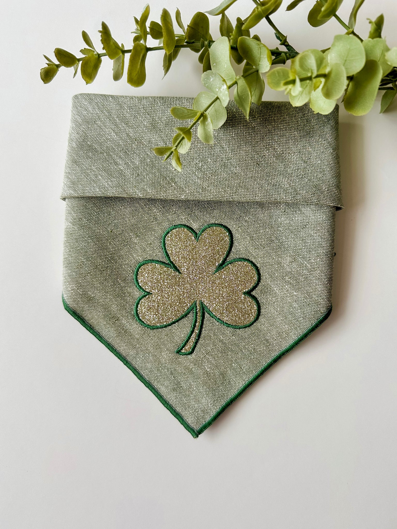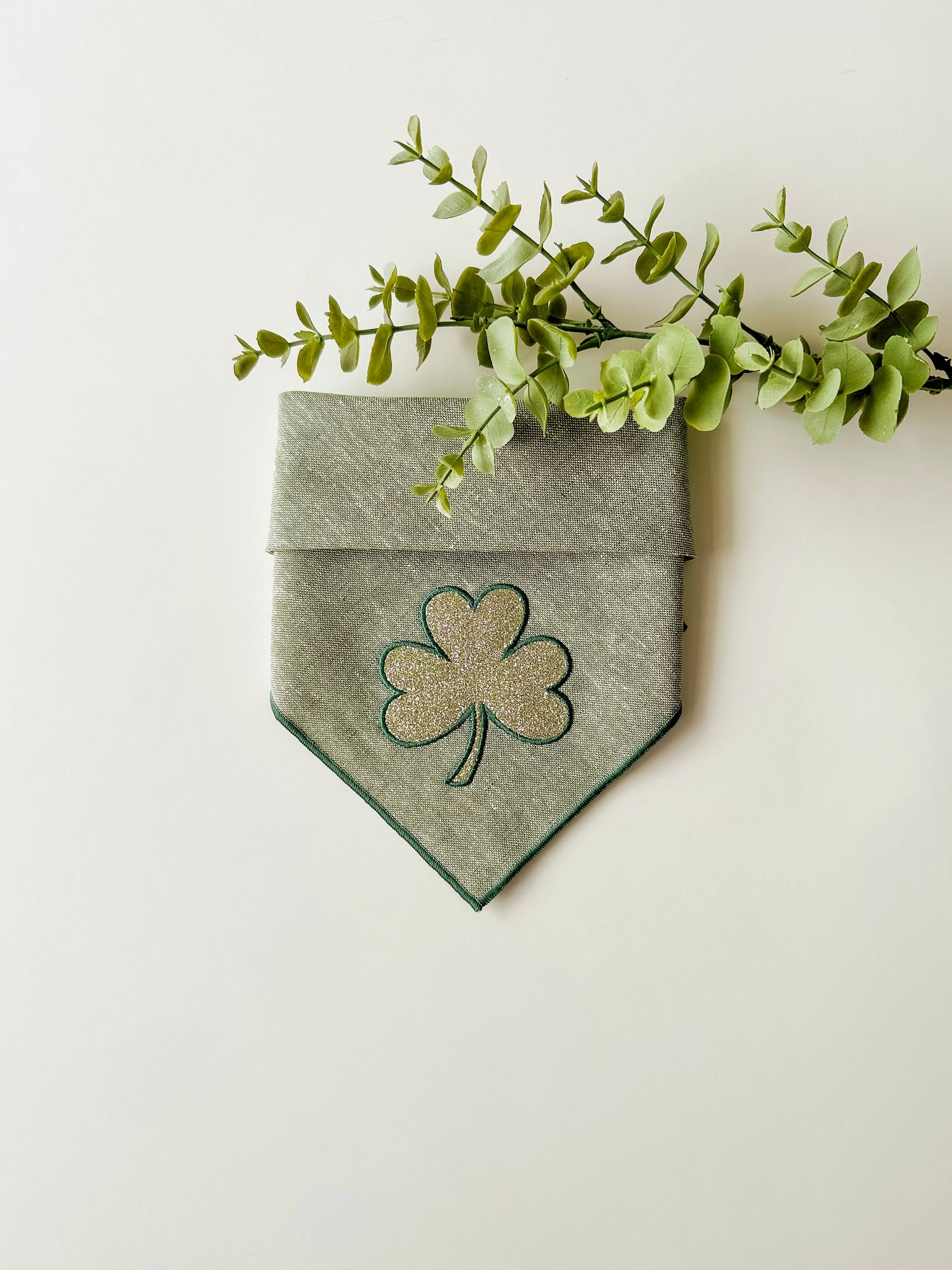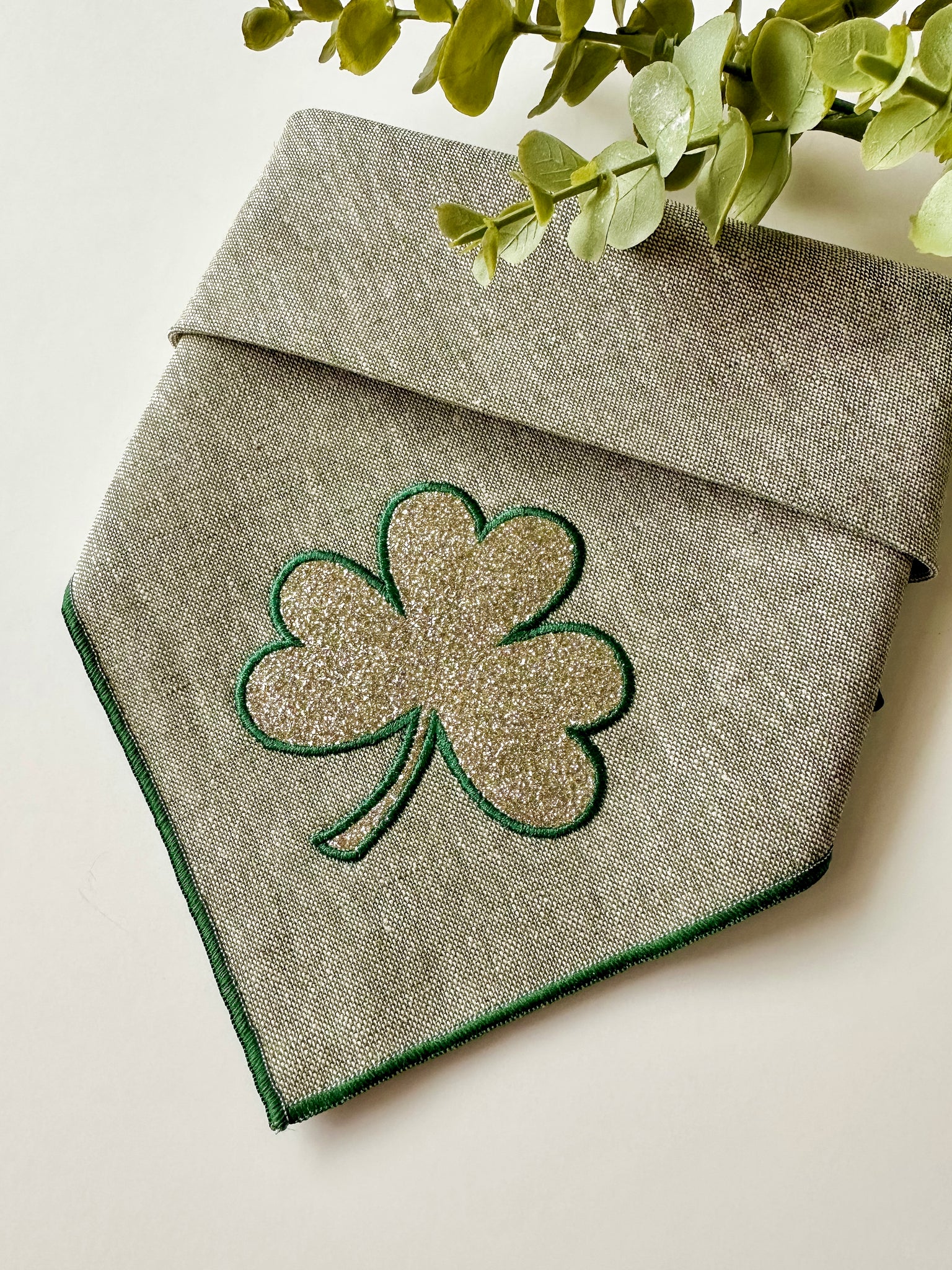 SPARKLY EMBROIDERED SHAMROCK - Bandana background is a sage green linen fabric so it has a slight texture to it. This bandana is customized with a sparkly champagne shamrock, and embroidered with a green outline. It has a matching green secure hem on the edge of the bandana as well. This bandana is not customizable, and comes exactly as it is pictured.